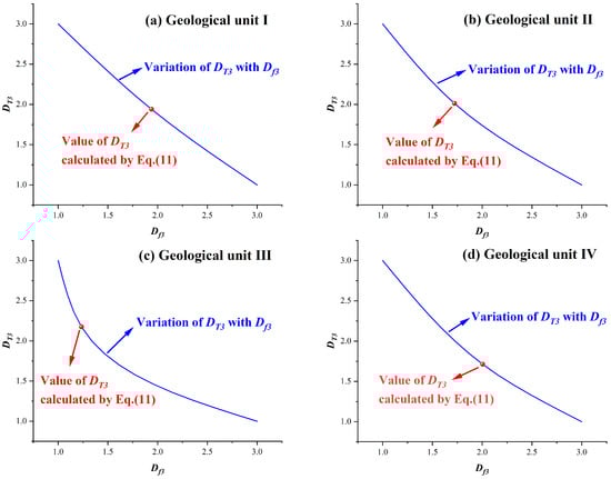 According to the basic parameters of faults, we can determine the fractal dimension for 3D fault tortuosity (DT3) in the geological units by Equations (10) and (11). The detailed calculating process for the values of DT3 in the geological units is shown in Figure 7: (a) The first column is set with a series of DT values, which are 1, 1.1, 1.2, …, 2.8, 2.9, and the second column edits Equation (11) to bring in the known parameters from Table 1, leaving only the DT for the variables, and then edits the DT from the first column into Equation (11). There must be two DT3 values such that the equation has a value between one positive and one negative, and then the solution to DT3 must lie between the two DT3 values; (b) find the two DT values, e.g., between 1.9 and 2.0, and set up a series of columns of data from 1.90, 1.91, 1.92, …, 1.99, 2.00, and again find the two DT values that make the above formula between positive and negative, e.g., between 1.90 and 1.91, and then set up another series of data columns from 1.350, 1.351, 1.352, …,1.359, 1. 360, and again find the two DT values; (c) make the above equation between positive and negative, and then repeat the iteration until the required number of decimal places have been calculated to obtain the value of DT3. By iterating the calculation, the DT3 for geological units I, II, III, and IV are 1.90737, 1.96026, 2.10998, and 1.69579, respectively.