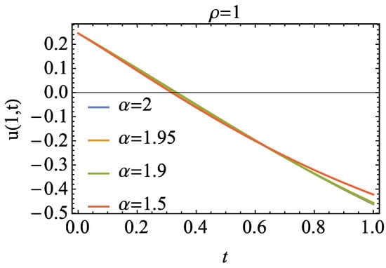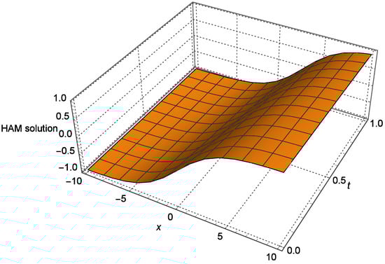 In this section, we apply the HAM to examine fractional Phi-4 Equation (2) under the specified initial conditions. The equation is considered with and , and the initial conditions are imposed as follows: