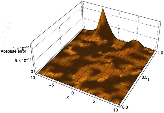 At this point, we present a comprehensive analysis of the 10th-order homotopy analysis method (HAM) solutions for the time-fractional Phi-4 equation. Our findings, illustrated in Figure 3, highlight the convergence of the approximate solution towards the exact solution, as depicted in Figure 4. It is clear that the solution satisfies the boundary conditions and . Furthermore, Figure 5 provides the absolute error between the exact solution and the 10th-order HAM solution. The convergence and the stability of the solution are experimentally presented in Table 1, which gives the absolute error for , different values of x, and a number of series terms M. It is clear that as M increases, the absolute error becomes closer to zero. Similarly, as x increases, the error can fit as a linearly increase, which indicates a little about stability.