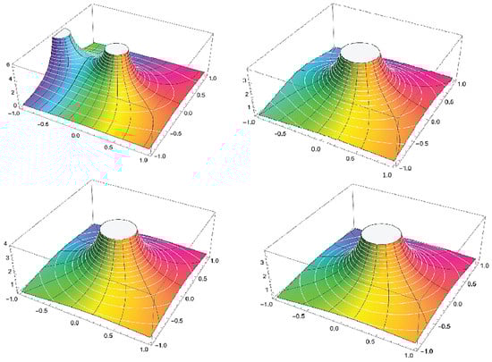 - Certain exceptional operators, such as the Alexander and Libra operators, are recognized together with the structure of the complex fractal–fractional operators:andaccordingly []. For instant (see Figure 2)and