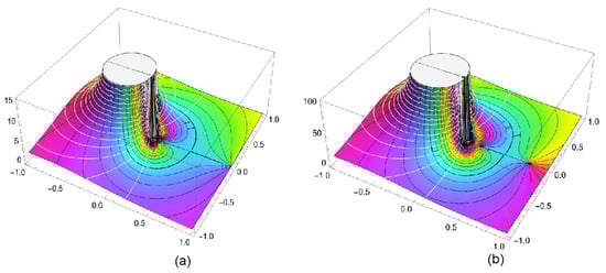 Figure 2. The 3D-complex plot of accordingly, where the z-axis presents the operator in (a) and in (b). - Three complex analytic functions are used to formulate the operator : the fundamental function σ, the extreme function of starlikeness, and the normalized Fox-Wright function. But, the operator is structured by double analytic functions. In the same way, for the integral operator As a conclusion of this point, the normalized fractal–fractional operators can be checked geometrically based on the properties of (see Theorem 2).
