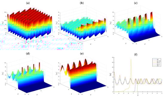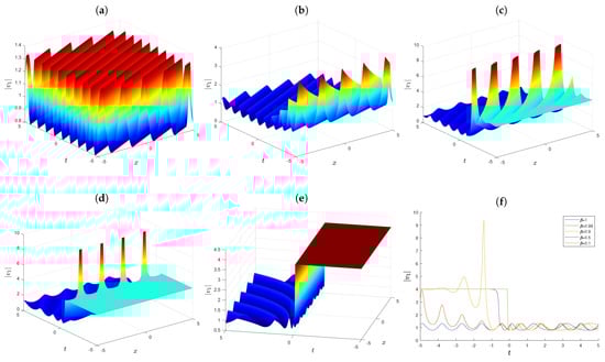 To describe the effect of , we set the parameters , , and , while varying the value of from 1 to . The graphs of are depicted in Figure 1 and Figure 2, respectively. In Figure 1a–e, the behaviors of are illustrated for values of , and , respectively. The characteristics at for various values of are shown in Figure 1f. Similarly, uses the same parameters as , and the corresponding plots are shown in Figure 2a–f.