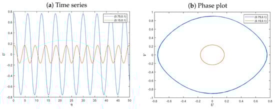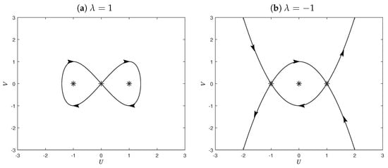 To analyze system (21), we list the effect of bifurcation by plotting the phase portraits of the system in Figure 3. Case I is shown in Figure 3a by letting the value of the system parameter , while Figure 3b depicts case II by setting the value of system parameter . From Figure 3, we can study the bifurcation behaviors when the values of parameters alter. Therefore, the dynamics behaviors are remarkably affected by the bifurcations.