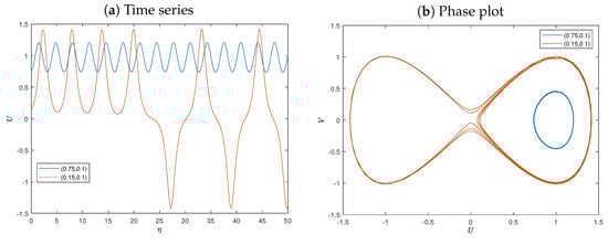 We examined the sensitivity behaviors of Equation (14) concerning the initial values of cases I and II, as previously discussed. The results for the parameter according to case I are illustrated in Figure 4, while Figure 5 shows the outcomes for case II. In Figure 4 and Figure 5, the red curve represents the initiation at , and the blue curve represents the initiation at . Figure 4a and Figure 5a exhibit the time series for the model (21). In addition, Figure 4b and Figure 5b display phase portraits of system (21) initiated from two distinct initial conditions, highlighting sensitivity impacts. To evaluate the impact of sensitivity variations, we undertook a comparative analysis of the pathways emanating from diverse initial conditions, specifically focusing on the distinguishing patterns between the blue and red curves presented in Figure 4a,b and Figure 5a,b. The results indicate that significant changes in initial conditions have a considerable impact on the dynamic behavior of the system when the remaining parameters remain constant. Moreover, we investigated the system’s sensitivity to parameter variations by comparing Figure 4a,b with Figure 5a,b, demonstrating a significant sensitivity of the system to alterations in its parameters.