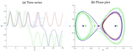 We valued the parameters and as follows. In Figure 6 and Figure 7, we kept and let . The red curve represents the simulation results for the time series and phase orbits. Then, we adjusted to and ; the graphical depiction of the simulation outcomes is distinctively presented via the blue and green lines, respectively. The simulation highlights a pivotal observation: the divergence between the red line and the aforementioned curves underscores the emergence of chaotic system dynamics contingent upon the presence of noise. Notably, in both scenarios under consideration, the system manifests a pronounced sensitivity to variations in the amplitude parameter .