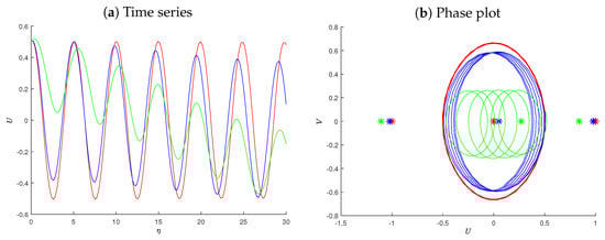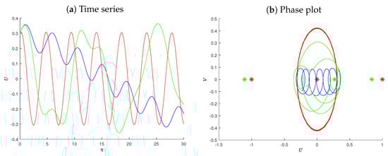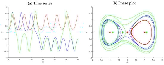 In Figure 8 and Figure 9, we set to 0. The red curve illustrates the simulation results for both the time series and phase orbits. We then adjusted to and to and , with the results represented by the blue and green curves, respectively. The distinction between the red curve and the others indicates that the system exhibits chaotic behavior while the noise term is present. In both cases, the system’s sensitivity to the frequency is significant.