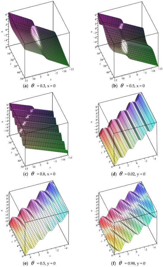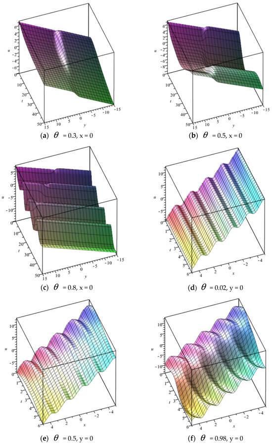 From (a) to (c) in Figure 1, it can be observed that the periodicity of the solution gradually emerges and becomes apparent as an increase in the fractional order. From (d) to (f), we can see that the periodicity of the solution gradually decreases with the increase in the fractional order. That is to say, the geometric shapes of the solution (57) have changed a lot due to the variation in the fractional order.