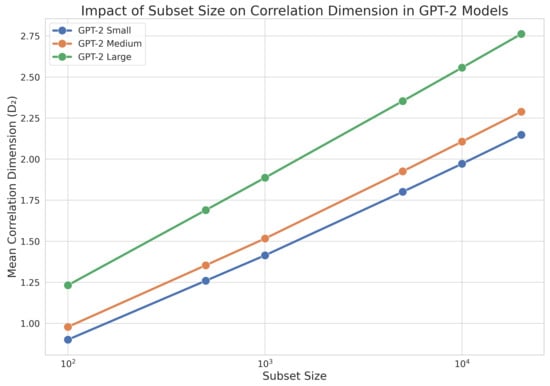 Impact of subset size on correlation dimension for different GPT-2 model sizes.