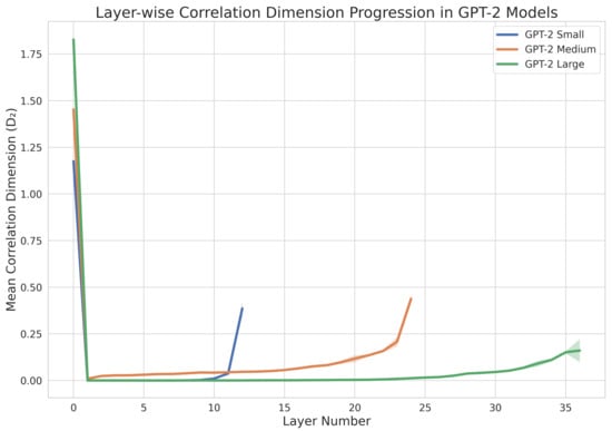 The layer-wise analysis of the progression of the correlation dimension through GPT-2 networks provided novel insights into the evolution of the token representation complexity during language processing. We observed a consistent pattern of an increasing correlation dimension from the initial to the final layers, with the embedding layer exhibiting the highest complexity. This pattern can be formalized as follows: