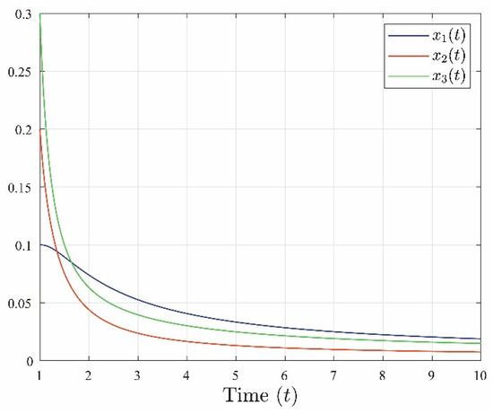 = 0.95. The order of the fractional derivative does not significantly affect the results; we chose these values randomly to generate curves and simulations. We can adjust the order and produce different curves, which will yield similar results. The primary difference may lie in the transient regime, which is not the main focus of this work. Our primary objective is to demonstrate Mittag-Leffler stability, irrespective of the transient regime duration and behaviors.