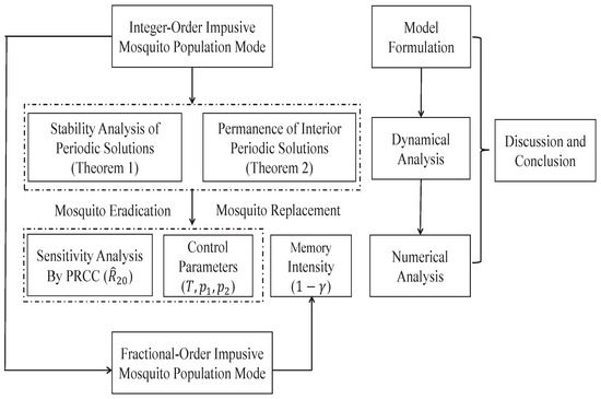 The structure of this paper is as follows: In Section 2, an integer-order mosquito population model incorporating impulsive insecticide spraying is presented to illustrate the spread of Wolbachia in the wild mosquito population. The stability and persistence of the periodic solutions are proved. Section 3 examines the effects of pulse periods and killing rates on the two control strategies, as well as a global sensitivity analysis. Also, a Caputo fractional-order impulsive model is developed to investigate the impact of memory factors on the two control strategies. Section 4 provides some discussions and insights for future research. The Section 5 presents the main conclusion of this work. The specific methodological flow chart is shown in Figure 1.