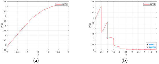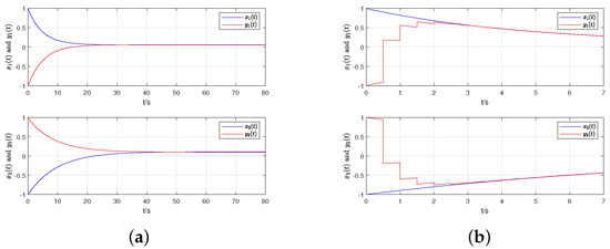 When , there are , by Theorem 3, the above systems can achieve exponential quasi-synchronization and eventually, the system error will converge to δ, where . Select the impulsive period to be and the initial value to , and , . The quasi-synchronous evolution of the system is shown in Figure 2; both the control and control outcomes are included in Figure 2a,b. It can be seen that after impulsive control, the divergent error system can converge to a region of no more than 0.03733, which is close to the error region estimated by Theorem 3, which also shows that the selected impulsive controller has good performance. The state error of each system is shown in Figure 3; both the control and non-control outcomes are included in Figure 3a,b. It can be seen that the effect of the controller (5) on the state error of each system is obvious. Further, the trajectory of each subsystem is shown in Figure 4a, and the trajectory under the action of the controller is shown in Figure 4b.
