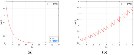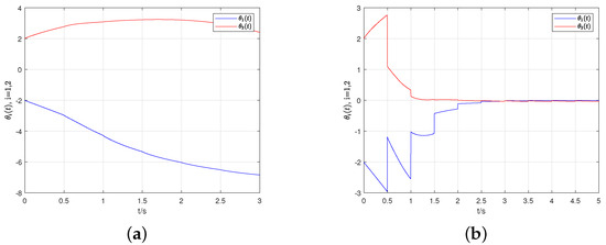 It is easy to obtain , and then , so in Theorem 3. Let , , , let , then , and and by the definition of ϕ and ℏ. Select the impulsive period to be and set the initial values to , and , .
