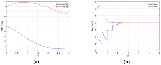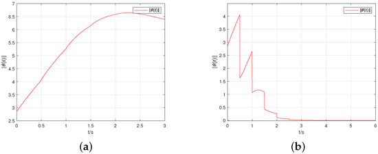 Figure 8 shows the impulsive inference on the system, which makes the system diverge. Comparing the two, Figure 8a and Figure 8b of Figure 8, it can be found that the system error can converge to a certain bounded value, but after the action of controller (5), the system error increases or even diverges. Of course, by comparing with Figure 5, it can be found that not all impulsive control will have a negative impact on the system, because this is related to the impulsive period T and the impulsive gain d.