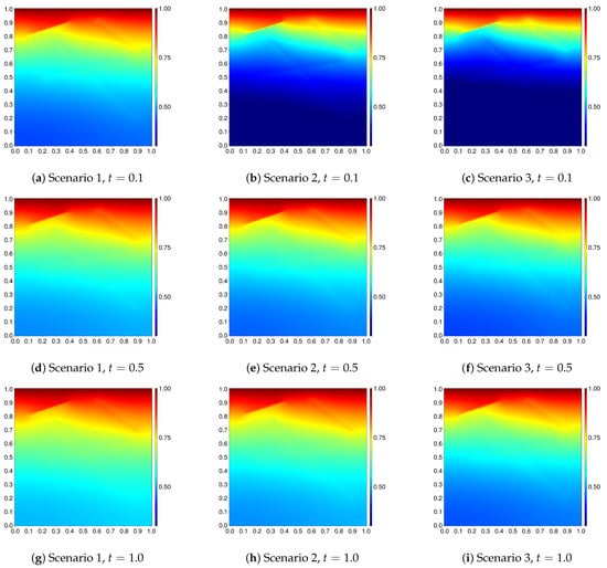 Thirdly, due to the extreme complexity of obtaining an analytical solution to this problem, there is a need to develop approximate methods. However, along with the computational difficulties inherent in solving constant-order fractional differential equations (i.e., the labor intensity of calculating discrete analogs of fractional derivatives [,]), solving equations with variable-order fractional derivatives gives rise to other difficulties. For example, the coefficient matrices of numerical schemes lose the structure of the Toeplitz matrix [], which does not allow the use of fast algorithms for calculating fractional derivatives. In addition, it is known that it is quite difficult to obtain approximation formulas for fractional derivatives of variable order higher than the second order [,]. It should be noted that many of the known approaches to solving problems of this class are based on the use of simpler finite-difference methods and collocation methods with preliminary application of the Laplace transform. Insufficient attention has been paid to more universal finite element methods (for example, discontinuous Galerkin methods), which remove restrictions on the integration domain and allow the use of discontinuous coefficients that arise in the case of filtration in heterogeneous media, without any particular difficulties. In addition, few works [] have been devoted to the study of equations containing several fractional derivatives of variable order of different orders, and the results obtained in these works cannot be directly applied to the solution of filtration equations.