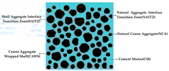 According to the physical experiment, the total size of the model and the proportion of coarse aggregate were selected, and the reclaimed aggregate concrete was regarded as a composite model composed of five phases: the natural coarse aggregate phase, the natural aggregate interface transition zone, the mortar phase, the shell coarse aggregate phase, and the shell aggregate interface transition zone. CAWS is nearly spherical, the model is replaced by a circle, NCA is polyhedral, and the aggregate particles are assumed to be polygonal. The placement of aggregates requires the setting of random variables. According to the Monte Carlo method [,], random variables in any interval can be obtained based on the transformation of random variables in the interval [0, 1] as follows: