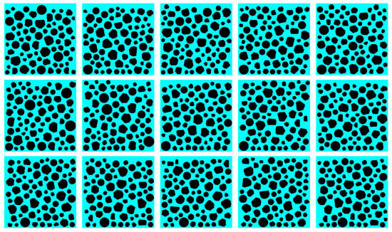 In this study, the maximum aggregate particle size was 15 mm, and the thickness of the interfacial transition zone was 150 microns, which basically meets the requirements of the literature []. In the mesoscopic study of reclaimed soil mixture materials, the mesoscopic parameters of materials in the interfacial transition zone often play a crucial role. The relevant inversion method based on BBD (Box–Behnken design) was adopted [], and the mesoscopic parameters of each material are listed in Table 1.