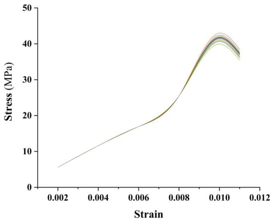 When the spectrum width is larger, it indicates that the more irregular aggregate distribution makes the crack propagation path more complicated under the same stress condition, and the complex path prolongs the cracking process, resulting in a certain mechanical bite between the cracks. The peak stress is increased to a certain extent [].