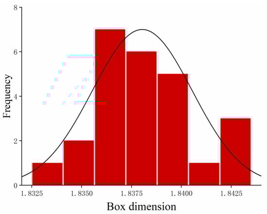 The box dimension of the 25 groups of specimens was calculated according to relevant formulas, Shapiro–Wilk normality test was performed, and the cumulative probability distribution histogram was drawn to visually display the distribution of the data(as shown in Figure 6).