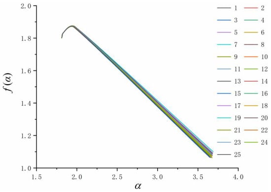 It can be seen from the Figure 8 that the curves of each group are not the same but have a similar trend of image change; that is, is a unimodal convex function of α, which is an increasing function on the side of > 0 and a decreasing function on the side of < 0. The maximum value is also the maximum , that is, the number of capacity bits, which is obtained at = 0 and conforms to the multifractal characteristics. Therefore, the distribution of aggregate can be characterized by spectral width , which can realize the magnification details that cannot be realized by a single fractal, and the role of aggregate distribution can be quantitatively studied.