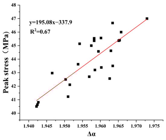 The multifractal spectral width is a measure of distribution inhomogeneity, and the larger the spectral width, the more obvious the difference in the graph. According to the existing literature [], when the spectral width difference is larger, the overall spectral width is larger, and the peak stress is smaller. In this study, which builds upon the existing literature, the maximum fractal spectral width of each group was 1.942, the minimum value was 1.973, and the overall difference was not large, indicating that the overall distribution of aggregates was relatively uniform. Therefore, the peak stress was relatively stable in the range of 39–47 MPa. When the overall difference in the spectral width is not large, the larger the spectral width, the greater the peak stress.
