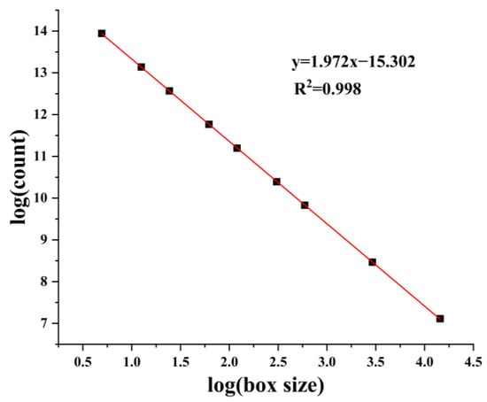 It was found that the fractal dimension satisfied the linear relationship and the fitting degree was close to 1, indicating that the crack has fractal characteristics and the distribution pattern of the crack can be studied by the box dimension (as shown in Figure 11).