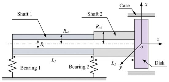 This study investigates the dynamics of a hollow shaft rotor with a cantilevered disk, as illustrated in Figure 1. Derived from the simplification of an oxygen pump, this system epitomizes the typical cantilever configuration widely adopted in industry []. It is supported by two isotropic linear bearings with identical stiffness in the x and y directions. The disk has a mass of , and its polar moment of inertia and diameter moment of inertia are denoted as and , respectively. Damping effects are integrated into viscous damping, represented by . The stator is mounted close to the mass disk, and the gap between the rotor and stator is denoted by . They come into contact when the vibration amplitude of the rotor reaches its limit. The reactive forces during contact are depicted in Figure 2.