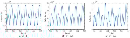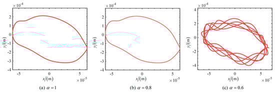 Based on the deterministic model and numerical simulations, the steady-state orbit, radial deflection, and spectrum of the geometric center of the disc at ω = 200 rad/s are analyzed for different damping orders. In the steady-state analysis, the initial period is ignored to eliminate transient effects. The steady-state deflection curves and axial orbits for orders of α = 1, 0.8, and 0.6 are shown in Figure 3 and Figure 4, respectively. It degrades to the integral order case for α = 1. The comparison between fractional calculations and those of the integral order are incorporated throughout all the discussions.