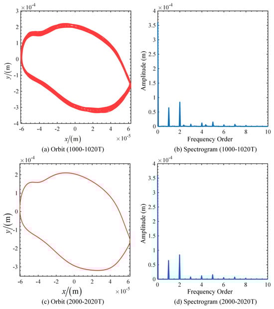 From Figure 3 and Figure 4, the steady-state time-domain curves and the axial orbits show significant nonlinearities. The time response curve becomes complex and is no longer a simple sine or cosine wave, while the axial estimates are no longer circular or elliptical. This indicates the presence of multiple frequency components in the response beyond the fundamental frequency. The main reason for this is that the unbalance and asymmetry of the system can lead to irregular forces in the rotor during rotation, and that rub and impact forces introduce high-frequency components and transient responses. It is also evident that after 500 cycles, the system responses of orders and have entered the steady state, while the system of order is still in the unsteady state. To explore the steady-state response of the 0.6 order system, we analyzed the system response after a longer time. Figure 5 shows the center orbit and spectrogram of radial deflection for the 0.6-order system for periods 1000–1020 and 2000–2020.
