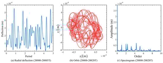 To investigate the response characteristics of the 0.4-order system, numerical simulations and analyses were run for a longer period. The radial deflection curves, orbit, and spectrograms for the system with after 20,000 periods are shown in Figure 6. It can be seen from the figure that the response of the system fails to reach a steady state after a long period of running. The time response curves, axial orbits, and spectrograms show complex irregular characteristics. This indicates that low-order fractional-order damping and rubbing impacts have a significant effect on the dynamic behavior of the rotor system, especially in the case of low-order fractional damping, where the system exhibits a complex chaotic behavior.