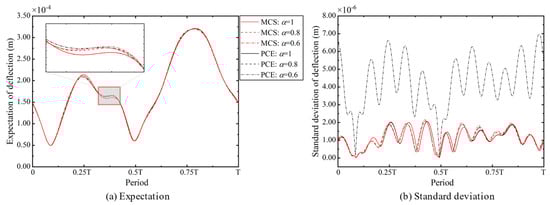 We establish the sparse grid PCE metamodel for uncertainty analysis and compare the results with MCS. Figure 7 gives the expectation and standard deviation of the steady-state deflection obtained from the 4th-order SGPCE and MCS for the three cases .
