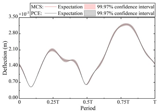 As can be seen in Figure 7, the expectations of the responses of the three fractional damping systems are almost the same for the same uncertainty, while the standard deviations are different. The standard deviation, in general, increases as the order of the fractional order derivative decreases. This is consistent with the results of the deterministic analysis, again indicating that the order of damping changes the characteristics of the system response. Furthermore, the expectation and standard deviation obtained from the 4th-order SGPCE are almost identical to those obtained from the MCS when = 1 and 0.8. However, the 4th-order SGPCE requires only 494 sample points, the full grid PCE requires 625 sample points, and the MCS requires 3000 sample points. This indicates that SGPCE is more efficient than traditional FGPCE and MCS and is accurate. As the order A decreases to 0.6, the results of the 4th-order SGPCE are no longer accurate, so we use the 4th-order FGPCE. The 99.97% confidence intervals for the radial deflections obtained by the 4th-order FGPCE and MCS for a = 0.6 are shown in Figure 8.