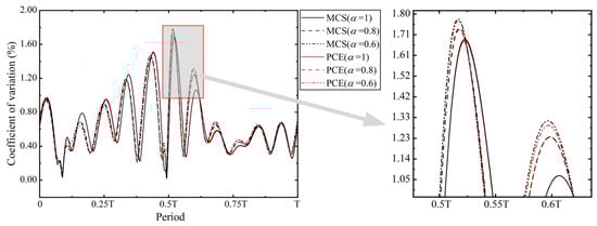 To quantify the volatility of the stochastic response of the rubbing overhung rotor system in the three fractional damping cases, we present in Figure 9 the coefficient of variation curves of the deflections obtained by MCS and PCE for the three cases. The results of the MCS are in agreement with those of the PCE for all three cases. The maximum coefficient of variation for all three cases occurs at the same moment, but the maximum coefficient of variation increases as the order decreases and reaches almost 1.8% when = 0.6. The coefficient of variation can be used as an index of robustness, and the analysis of the coefficient of variation shows that the robustness of the system decreases with the decrease in the order. This also explains the reason why it is difficult for the system to reach a steady state as the order decreases.