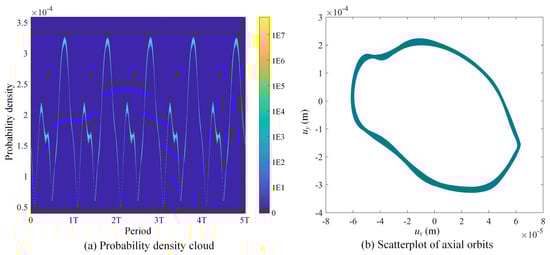 The probability density cloud of the radial deflection and the point cloud plot of the axial orbit of the steady-state response when the order of damping is 0.6 are given in Figure 10. The probability density cloud allows for a visualization of the probability distribution characteristics of the radial deflection in the time domain and identifies the high-probability regions as peaks and valleys. Figure 10b shows that the basic shape of the axial orbit of the rotor in the uncertainty case is similar to the deterministic result. However, the axial orbit in the uncertainty case has a width, and this width range indicates the possible interval of the response. In summary, the vibration modes of the 0.6-order damped system under 1% uncertainty are almost unchanged, except for some fluctuations in the values of the response.