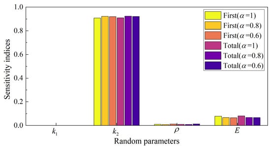 Sensitivity metrics of peak deflection with respect to 4 random parameters in three cases.