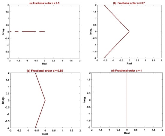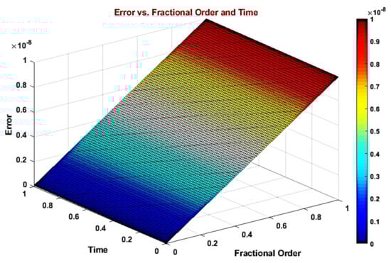 Figure 8 displays the stability regions for a numerical method at various fractional orders (α). Each subplot represents a different α value: 0.5, 0.7, 0.85, and 1. The plots show the eigenvalues of the coefficient matrix () in the complex plane (Real vs. Imaginary). At α = 0.5, the eigenvalues are all located on the real axis near −0.5. Since the magnitude of these eigenvalues is less than 1, this indicates stability for this fractional order. At α = 0.7, the eigenvalues form a V-shape, extending into both the positive and negative real axis. A portion of the eigenvalues have magnitudes greater than 1 (outside the unit circle), indicating instability in this region. The region of stability is limited to the portion of the V-shape within the unit circle. At α = 0.85, the eigenvalues form an inverted V-shape. Similar to (b), portions of the eigenvalues are outside the unit circle, indicating instability. The region of stability is again limited to the portion within the unit circle. At α = 1, the eigenvalues lie entirely on the negative real axis, forming a vertical line. All eigenvalues appear to be within the unit circle, suggesting stability for this fractional order (which corresponds to the standard integer-order case). Furthermore, Figure 9 depicts the error propagation in relation to time and fractional order.