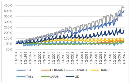 We used quarterly data on Total Retail Sales to measure private consumption across G7 countries from 1994 Q1 to 2022 Q4, allowing for analysis across various business cycles, including three big recession periods: Dotcom, Great Recession, and COVID. The data were collected from Thomson Reuters Eikon-Datastream, with original data sources from Canada (Statistics Canada), Japan (Ministry of Economy, Trade and Industry), the USA (U.S. Census Bureau), Germany (Federal Statistical Office), France (Banque de France), Italy (National Institute of Statistics), and the UK (Office for National Statistics). The time series were seasonally unadjusted and rebased to Q1-94 = 100 for homogeneous comparisons.