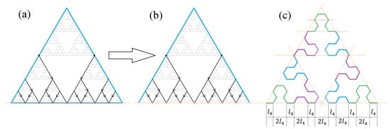 Alternatively, the Sierpiński triangle can be obtained after an infinite number of iterations of the Sierpiński arrowhead curve (SAC) [], as it is shown in Figure 1c. Notice that, after iteration steps, the self-avoiding arrowhead curve has edges of length and vertices. As in the case of SG, there are many different ways to construct the SAC which fills the Sierpiński triangle everywhere densely [,,,,].