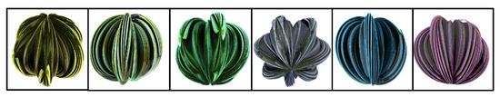 equivalent to a boolean vector of length 9. The obtained dataset MandelbulbVAR-1k is composed of 1037 variations. For more details, see [17,35]. To overcome the limited number of variants, the authors use the Hybrid Mandelbulb Variations, obtained by combining two Mandelbulb Variations. With this hybrid version, they obtained a dataset with 21 k variations, MandelbulbVAR-Hybrid-21k. Throughout this paper, we will refer to the two datasets collectively as Mandelbulbs, using specific names when we need to precisely identify one of the two, in Figure 2 some examples of generated samples are shown.