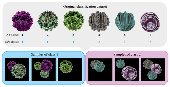 We took inspiration from [15,19], which use FDSL, respectively, for semantic segmentation and multi-instance classification. The two approaches create an abstract scene with several different geometric structures within the same image. We adopted the idea of objects of different classes in the same scene to characteristics of the same class in the same image. For example, to classify a house, we may have images of various homes, but what defines a home? For instance, having walls, windows, doors, and a roof are individual characteristics or features that together define a home. We applied the same concepts to fractals. Consider an original dataset composed of n classes, where each class