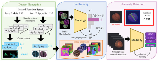 Fractals are complex geometric structures generated by mathematical equations; thus, anyone can produce the images, making them open-source, bypassing massive manual labelling and ethical or bias concerns. The work of Kataoka et al. [9] was the first to introduce the possibility of using fractals as an alternative pre-training method for image recognition tasks. In light of the promising results shown in image classification [15,16,17] and 3D scene-understanding [18], in this paper, we conducted extensive experiments to examine the potential utility of using a synthetically generated dataset composed of fractals for the detection and localization of anomalies such as those representing defects in industrial production processes. We generated two- and three-dimensional fractals following the implementation in [15,17] to create standard classification datasets. Moreover, inspired by the semantic segmentation task based on formula-driven supervised learning [19], we propose a novel approach to combine multiple fractal images. This approach uses groups of fractals to represent different characteristics of each class. A sample of a given class may include a variable number of fractals, which results in a “Multi-Formula” classification dataset. This introduces more complexity to the classification task with the model being able to learn more discriminative features. Nevertheless, contrary to the existing literature that mainly focuses on fractals’ transfer-learning ability for supervised classification, we compared the AD methods pre-trained with fractals against ImageNet without fine-tuning.
