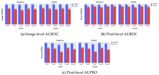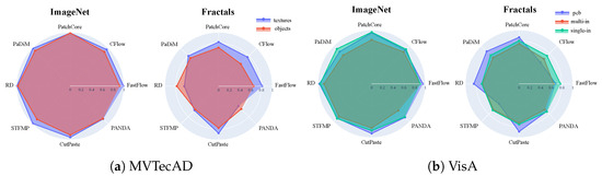 We further investigate the influence of training configuration and the significance of the latent space by comparing pre-training on ImageNet and MultiMandelbulbs-small. Table 15 and Table 16 present the results for the MultiMandelbulbs-small dataset, where we compare the original training setup from Section 7 (Baseline) with the three variations introduced in Section 7.3 (VAR1, VAR1-BATCH, VAR1-noSCHEDULER). These configurations are evaluated on the MVTec LOCO AD dataset. Unlike MVTecAD and VisA, MVTec LOCO AD poses a greater challenge as it contains structural and logical anomalies. In particular, addressing logical anomalies requires learned weights that can extract semantic representations which align with learning meaningful high-level features. However, a latent space with an elongated structure may compromise the overall quality of these learned representations. The tables below highlight the best results for the different training configurations for MultiMandelbulbs-small in orange. In Table 15, we have the image-level AUROC for three different AD methods, where all the variations adopted in Section 7.3 lead to an improvement in performance compared to the “Beseline”. For EfficientAD, the optimal configuration is “VAR1”, achieving a score of 0.811. For PUAD, the best-performing setup is “VAR1-BATCH” with a score of 0.837, while for SINBAD, the top result is obtained with “VAR1-noSCHEDULER”, scoring 0.788. The common factor of the different configurations compared to the “Baseline” is the different sets of transforms applied to the training and validation sets which follow [9]. Other training configurations, such as the scheduler and batch size, also affect performance depending on the specific AD model. For instance, in SINBAD, the score increases from 0.734 to 0.788 when the scheduler is removed. This highlights the strong correlation between model selection in FDSL and the AD method used in downstream tasks. In Table 16, we reported the results for EfficientAD using pixel-level sPRO obtained using the official evaluation code (https://www.mvtec.com/company/research/datasets/mvtec-loco, accessed on 4 November 2024) of MVTec LOCO AD. The sPRO score provides more precise localization results. The table shows that “VAR1” remains the best-performing configuration for EfficientAD.