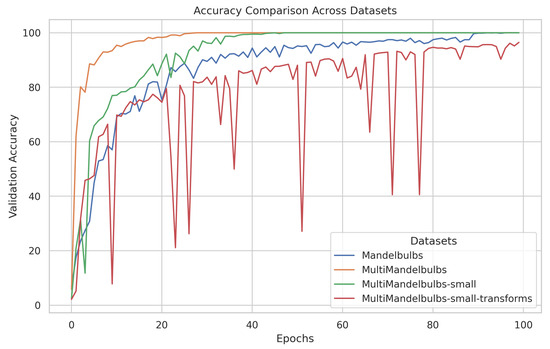 - We introduced a novel procedure for the generation of classification datasets dubbed “Multi-Formula” that integrates multiple fractals, increasing the number of characteristics for each class, and showed that this strategy led to improved performance compared to the standard classification (“Single-Formula”) dataset under the same training condition.