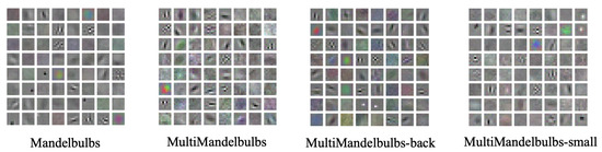 . In other words, each class can be considered as a combination of different attributes that could or could not be present. By composing multiple fractals into a single image, we generate multi-formula samples. This is because each class is formed by multiple mathematical formulas that produce distinct fractals. This approach contrasts with the previous datasets, Fractals and Mandelbulbs, where each class was generated by the iteration of a single formula, obtaining single-formula samples. Through the paper, the “Multi-Formula” datasets will be called MultiFractals or MultiMandelbulbs when using, respectively, Fractals or Mandelbulbs as the source dataset.