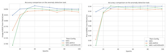 Image- (left) and pixel-level (right) AUROC scores achieved with PatchCore at various epochs of the pre-training stage using different training configurations.