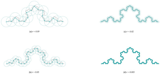 The blue line in Figure 1a–d, created with the yardstick method, constitutes a simplified representation of the actual shape of the Koch curve. The method establishes a kind of “yardstick” by drawing circles with a fixed radius