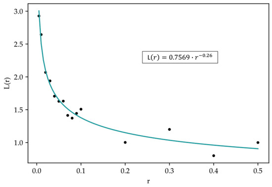 . The short-wave range () refers to the rails and the sleeper–ballast interface, the medium-wave range () to the ballast, and the long-wave range () to the substructure. Linear regression is utilized in each range to approximate the fractal value. Hansmann and Landgraf fix the first six points from the left in the Richardson plot for the short and medium ranges and the first three points from the right for the long wavelength range. For each subsegment range, the linear regression is calculated using the selected data points before additional data points from the respective range are gradually included. This is done until the highest coefficient of determination R2 is found. The slope of the final regression line indicates the extent of the fractal value and provides information about the cause of the error.