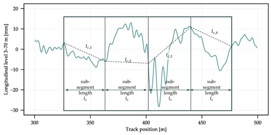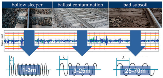 The signal analyzed in this study represents vertical track geometry irregularities with wavelengths ranging from 3 to 70 m. These irregularities primarily arise due to differential settlements in the ballast bed and the substructure [27]. Using fractal analysis, the track geometry irregularities can be assigned to different root causes (see Figure 5) [21,28,29]. In the fractal analysis, Hansmann and Landgraf use a window size of 150 meters to cover at least two full waves of the longest wavelength that may occur within the analyzed signal (i.e.,
