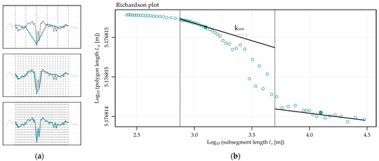 on the y-axis in a double logarithmic plot (Richardson plot, see Figure 7). As the length of the subsegments is decreasing, the resulting length of the polygon increases. Consequently, the established polygon gradually converges towards the original measurement signal.