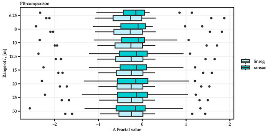 PR Comparison: Box plots of differences in fractal values (Δ fractal value) across various window sizes ranging from 6.25 to 50 m, calculated with linear regression (linreg) and RANSAC. Black dots indicate outliers, defined as values beyond